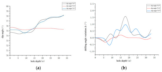 Schematic diagram of the gas drainage borehole inclination angle of 75° and its variation value with hole depth: (a) Schematic diagram of the variation in the inclination angle of the gas drainage hole with the hole depth. (b) Schematic diagram of the variation in the inclination angle of the gas drainage hole with the hole depth.