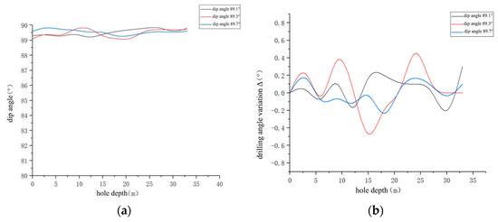 It can be seen from Figure 10 that the change Δ value of the borehole inclination varies with the borehole inclination, and the whole presents a quadratic function. When the borehole inclination is 15° and 90°, the change in the Δ value of the borehole inclination is close to 0°, that is to say, the deviation of the gas drainage hole is the smallest. When the drilling inclination is 30° and 75°, the change in the Δ value of the drilling inclination is close to 2.5°, that is, the deviation of the gas drainage hole. When the borehole inclination angle is 45° and 60°, the change in the Δ value of the borehole inclination is close to 4.5°, and when the borehole inclination is 50°, the change in the Δ value of the borehole inclination is close to 5°, that is, this sub-gas drainage borehole has the largest deflection. Combined with the actual engineering needs of the 14205 working face (the research site) for effective gas drainage, to ensure that the borehole can accurately reach the target gas-rich area and avoid forming drainage blind spots, the on-site actual limiting value of borehole deviation is set to ≤8°. The maximum borehole deviation Δ value (≈5°) obtained from Figure 10 is within this actual limiting range, indicating that the borehole deviation in this study meets the on-site practical requirements for stable and efficient gas drainage.