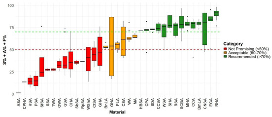 The compliance of alternative ABAs with the ASTM C618-22 standard was evaluated to determine their suitability for use as pozzolans in cement for concrete production. This assessment focused on the chemical composition of the materials, as pozzolanic reactivity—a key factor in improving concrete performance—is strongly linked to the content of pozzolanic oxides. The percentages of pozzolanic oxides can be derived from the elemental composition data obtained using X-ray fluorescence (XRF), a widely used technique for determining the chemical composition of materials. According to ASTM C618-22, a material qualifies as a pozzolan if the combined content of silicon dioxide (SiO2), aluminum oxide (Al2O3), and iron oxide (Fe2O3)—collectively referred to as pozzolanic oxides—is equal to or greater than 50% by mass (i.e., SiO2% + Al2O3% + Fe2O3% ≥ 50% [42]. This criterion represents a revision from earlier editions of the standard, which required a higher threshold of 70%. As shown in Figure 2, 20 out of the 35 ABAs analyzed met the minimum standard, qualifying them for further evaluation.