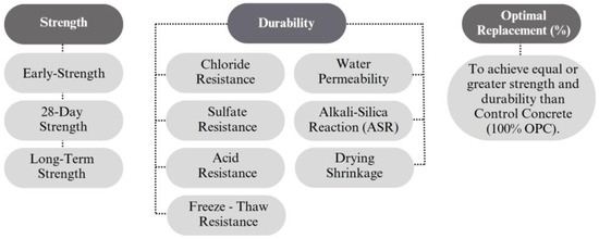 ABAs that passed the initial screening were further evaluated for their suitability in structural concrete using a decision matrix. The original framework included four criteria—strength, durability, carbon emission reduction, and economic value. However, due to limited data for the latter two, they were replaced with the criterion of optimal replacement percentage. This serves as a proxy, based on the premise that higher replacement levels typically indicate both lower carbon emissions and greater cost-effectiveness. As a result, the evaluation focused on three key criteria: strength, durability, and optimal replacement level. Detailed subcategories were developed for both strength and durability, as illustrated in Figure 3. These criteria were chosen to address sustainability goals while ensuring essential performance characteristics for structural applications.
