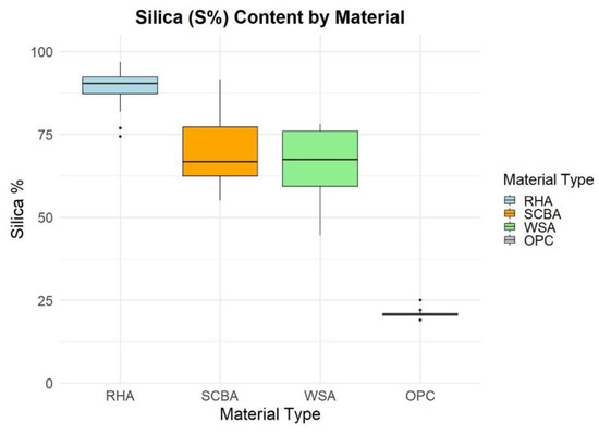 SiO2% (S%) Content of Selected Agricultural Biomass Ashes (ABAs) and Ordinary Portland Cement (OPC).