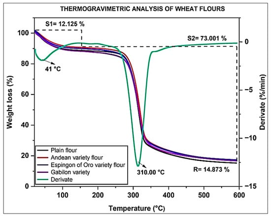 Thermal stability is essential for understanding flour behavior during processing and storage, helping to optimize baking and preservation processes [19]. It also allows for identifying optimal temperatures for different processing stages, such as kneading and baking, minimizing flour degradation [45]. Figure 1 shows the thermal behavior of flour obtained from the new wheat varieties.