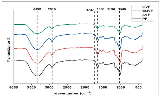 The ATR-FTIR spectra obtained for the PF, GVF, EOVF, and AVF flours revealed similar spectral profiles (Figure 4), with intense peaks in the range of 3360 to 1039 cm−1, suggesting a comparable chemical composition between the samples. The absence of significant differences in the infrared signals between the local flours and the PF indicates the presence of common functional groups, mainly associated with carbohydrates, water, lipids, and proteins. In particular, the band observed at 3360 cm−1 corresponds to stretching vibrations of the –OH group, associated with the presence of water and the soluble structure of carbohydrates [61], although its interpretation may be influenced by the spectral interference of the structure of alcohols, phenols, and hydroperoxides [60]. In the 2919 cm−1 region, this is attributed to the dominant vibration of the carbonyl group -CH-, which is related to the presence of starch (especially amylose and amylopectin) [61], as well as the presence of lipids in the 1772 cm−1 region [60]. These results are comparable with spelt variety wheat flour [27]. The 1660 cm−1 band length was characteristic of the C=O carboxylic group, which is associated with the presence of proteins [62], while the 1156 and 1039 cm−1 bands reflected the presence of primary and tertiary amines, sensitive to protein secondary structure [54,55]. These findings are consistent with those reported for spelt and buckwheat flours [20,26] and support previously obtained proximate composition data (Table 1), reinforcing the nutritional importance of local flours as potential ingredients in agri-food products.