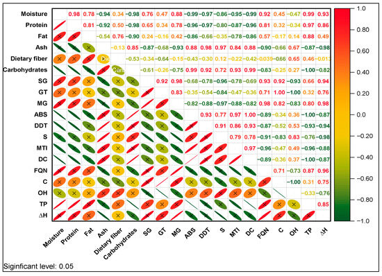 A positive correlation was also observed between protein content and amylographic properties, specifically at the start of gelatinization (SG), peak temperature (PT), gelatinization temperature (GT), and maximum gelatinization (MG). A moderate correlation was also identified with lipid content. These correlations suggest that both proteins and lipids influence the thermal behavior of starch during gelatinization [19,40]. The presence of proteins can form a physical barrier around starch granules, limiting water absorption, and raising the temperatures necessary for gelatinization [19]. Lipids can form complexes with amylose, stabilizing the granule structure and also contributing to the increase in these temperatures [66,67].