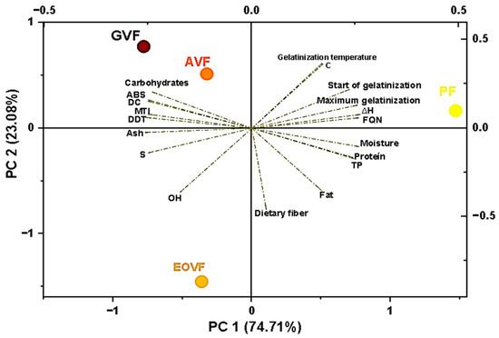 Principal Component Analysis (PCA) of flours from new wheat varieties and plain flour, based on their evaluated components. SG: start of gelatinization, GT: gelatinization temperature, MG: maximum gelatinization, ABS: consistency-corrected water absorption (%), DDT: dough development time (min), S: stability (min), MTI: mixing tolerance index (BU), DC: dough consistency (FE), FQN: farinograph quality number (min), C: carbon, OH: hydroxyl group, TP: peak temperature, ∆H: enthalpy of gelatinization, PF: plain flour, GVF: Gabilon variety flour, EOVF: Espigon de Oro variety flour, and AVF: Andino variety flour.