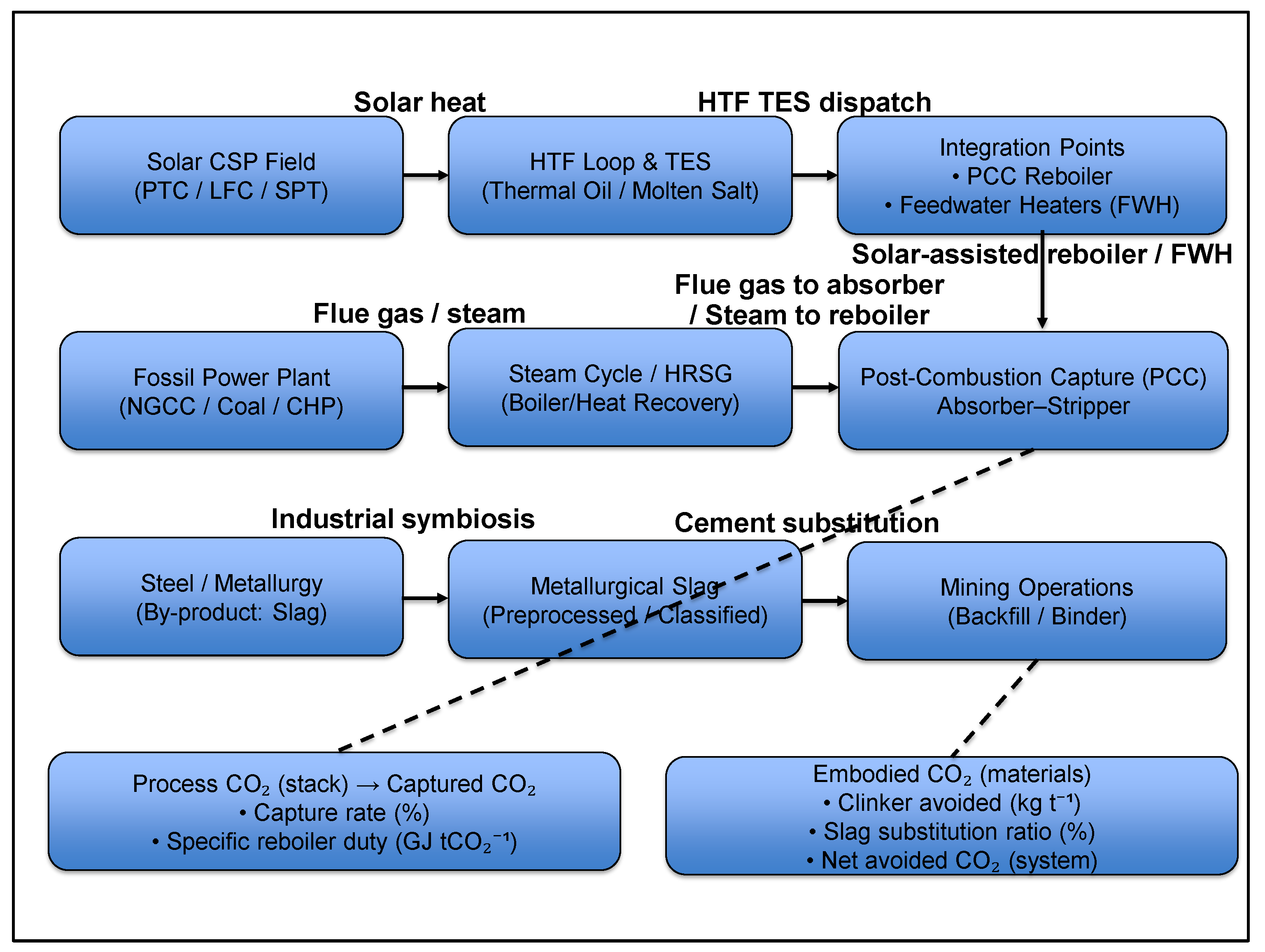 | Slag-based cement substitution in mine backfill | Steel → Mining | Avoided clinker production | Substitution ratio (%), kg clinker avoided·t−1, Δembodied CO2 (kgCO2·t−1) | Lowers life-cycle CO2; improves avoided-CO2 cost when credited |