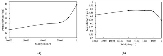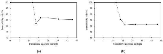 Experimental results of water sensitivity damage evaluation of cores with different permeabilities. (a) Core No. 1 (116.81 mD). (b) Core No. 2 (5.30 mD).