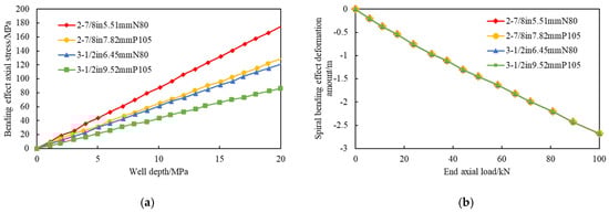 It is known that the expansion joint compensation distance is 3 m. The individual maxima arise under different boundary conditions and do not occur at the same time. Through the dynamic simulation and calculation of the integrated tubing string for acidizing and flow-back in Section 3.3, the deformation of different operation tubing strings under different conditions was measured []. As shown in Figure 21, the deformation of the tubing string is within the safe range within the expansion tube compensation range. The maximum axial force of the 2700 m operation tubing string is approximately 400 kN, the maximum axial stress is approximately 260 MPa, the safety factor is greater than 3.0, and the maximum deformation of the tubing string is approximately 1.1 m. The maximum axial force of the 3000 m operation tubing string is approximately 500 kN, the maximum axial stress is 300 MPa, the safety factor is greater than 3.0, and the maximum deformation of the tubing string is approximately 1.4 m. Meanwhile, the maximum axial force of the 3300 m operation tubing string is approximately 600 kN, the maximum axial stress is 350 MPa, the safety factor is greater than 3.0, and the maximum deformation of the tubing string is approximately 2.4 m. During the operation, the tubing string is relatively safe.