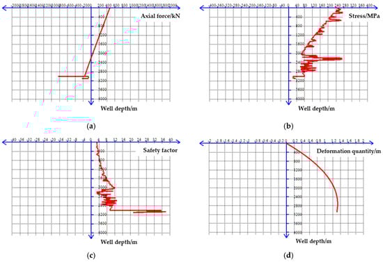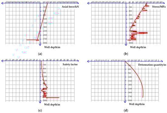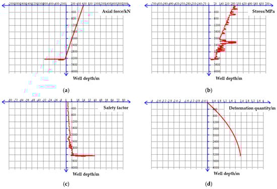 Mechanical analysis of the acidizing operation process for a 3000 m tubing string. (a) Axial stress. (b) Stress. (c) Safety factor. (d) Deformation quantity.