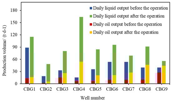 Before the acidizing and fluid return operation was carried out in other wells of the target block, the maximum daily liquid production was 89.0 t·d−1, the maximum daily oil production was 13.4 t·d−1, and the average daily liquid production of the 9 wells was 42.1 t·d−1, with an average daily oil production of 11.3 t·d−1. The comparison of liquid production before and after acidizing operations in other wells of the research area is shown in Figure 22. After the acidizing and fluid return operation, the maximum daily liquid production was 164.2 t·d−1, the maximum daily oil production was 54.1 t·d−1, the average daily liquid production of the 9 wells was 89.4 t·d−1, and the average daily oil production was 29.4 t·d−1. Among them, the maximum increase in daily liquid production per well exceeded 150.0 t·d−1, the maximum increase in daily oil production exceeded 45.0 t·d−1, the average daily liquid production increased by 47.3 t·d−1, and the daily oil production increased by 18.07 t·d−1.