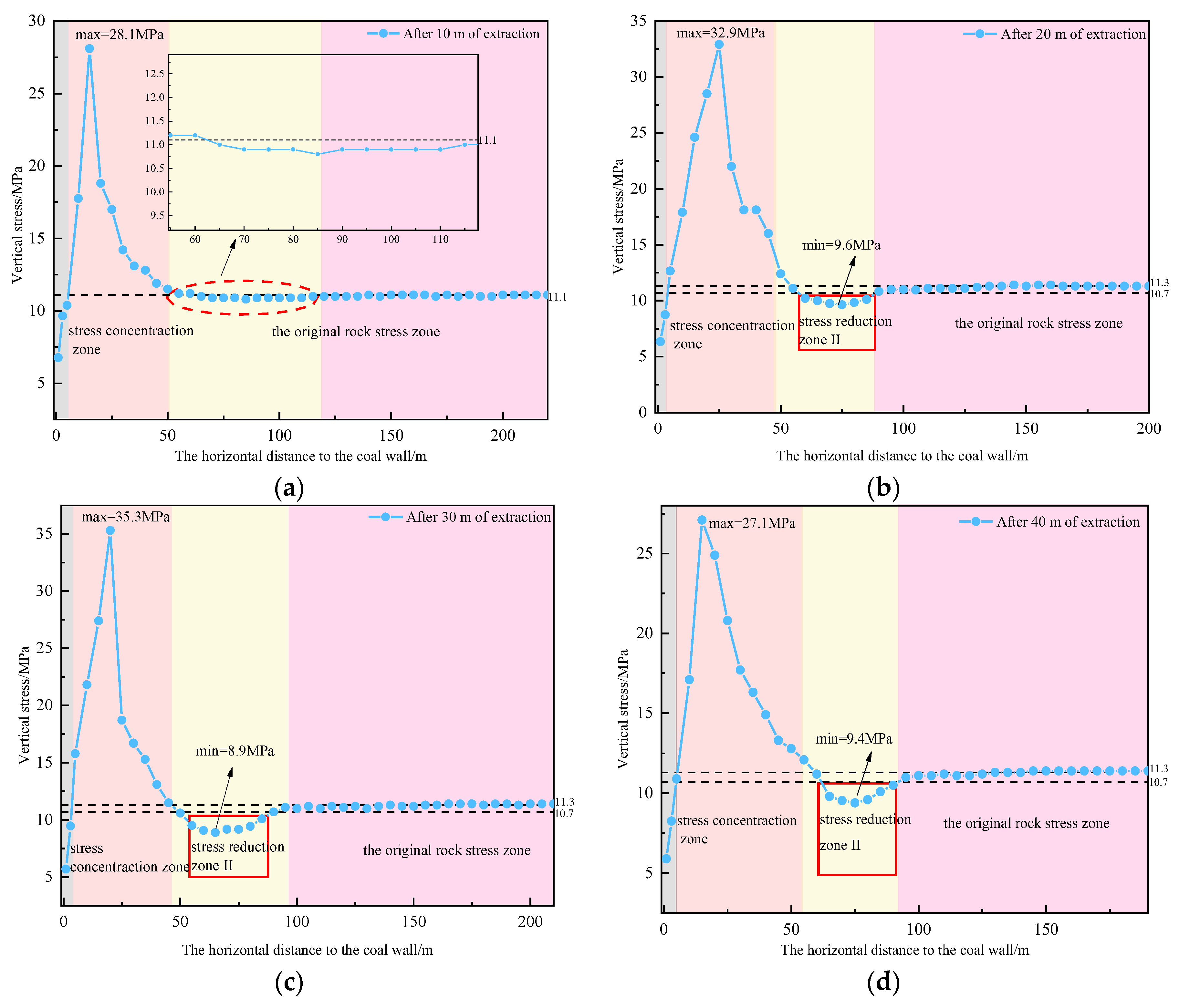 2.2.2. Coal Seam Stress Distribution at Different Mining Distances