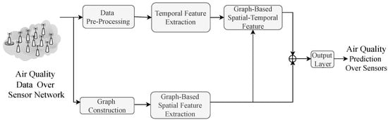 Common air pollutants include various substances such as gases, dust, smoke, and odors that can cause health and environmental problems. One primary concern is particulate matter (PM), with PM2.5 referring to fine particulate matter with a diameter of 2.5 μm or less. Cardiovascular disease, respiratory illnesses, and cancer can all be caused by exposure to fine particulate matter []. The monitoring of real-time air quality and the forecasting of the air quality index are attracting more and more attention. Pollution forecasts help decision-makers to implement pollution control measures in a timely manner, alert vulnerable populations, protect public health, and formulate sustainable policies to mitigate environmental damages. Many efforts have been made to predict air quality. These include physics-driven models, data-driven models, graph neural network-based models, and physics-informed neural network models.