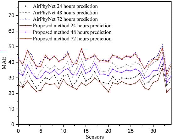To obtain a straightforward illustration, the MAE metric was calculated over each air quality monitoring station, as shown in Figure 3. We can observe that the proposed spatio-temporal feature fusion over the graph-based air quality forecasting model can obviously improve the prediction performance in 24 h air quality prediction, and it has a small improvement in long-term air quality prediction, e.g., in the 72 h air quality forecasting. The improvement in air quality forecasting performance is primarily due to the location-informed directed graph adjacency matrix as well as the characterization and extraction of the coupled temporal–spatial features involved in the proposed air quality prediction model.
