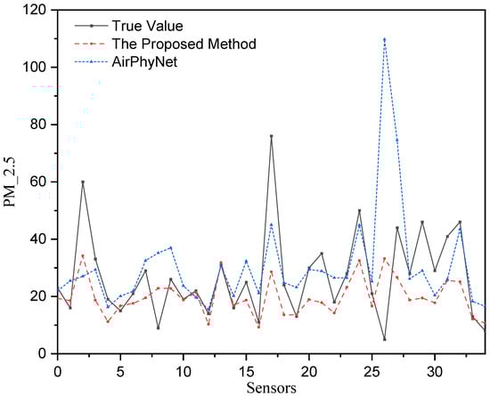 We show the comparisons of the true air quality data and the predicted data over all 35 sensors at the 24 h prediction performance in Figure 4. We can observe that the 24 h prediction of air quality of our proposed spatio-temporal feature fusion using graphs is very close to the true air quality value collected at the stations. The air quality prediction of AirPhyNet has large variations over several monitoring stations, leading to a worse performance in 24 h air quality prediction.