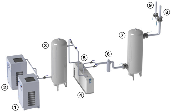 General layout of the baseline compressed air system. (1–2) Compressors; (3) wet air receiver; (4–5) dryers; (6) filtration unit; (7) dry air receiver; (8–9) distribution pipelines.