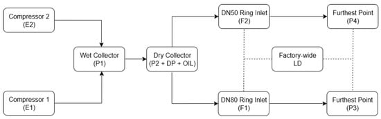 Schematic representation of the measurement setup. Energy analyzers (E1–E2) were installed at each compressor. A pressure sensor (P1) was located at the wet collector, while the dry collector was equipped with a pressure sensor (P2), a dew point sensor (DP), and an oil content monitor (OIL). Flow meters (F1–F2) were positioned at the inlets of the DN80 and DN50 ring lines, respectively. Pressure was monitored at the furthest points of each ring (P3 for DN50, P4 for DN80). Leakage detection (LD) was carried out factory-wide at the distribution points of both ring lines during production and non-production periods. Note: In the baseline configuration, collectors were not present; measurements at these locations were taken from equivalent junctions.