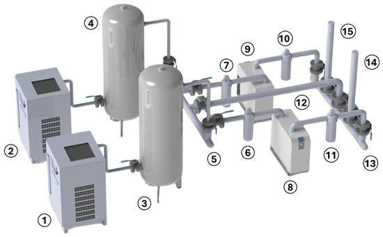 Layout of the optimized compressed air system. (1–2) Compressors; (3–4) wet air receivers; (5) wet collector; (6–7) pre-filters; (8–9) dryers; (10–11) final filters; (12) by-pass line; (13) dry collector; (14–15) distribution lines.