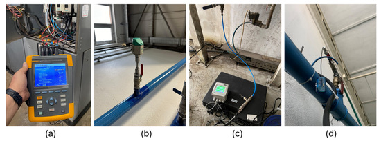 The performance evaluation was based on the simultaneous monitoring of energy consumption, pressure, flow rate, and air quality parameters. Sensors were installed at representative points of the supply, distribution, and demand sides. Data were synchronously recorded over a 24 h period through a unified acquisition system (see Section 2.2). Representative photographs of the measurement instruments used in the field are presented in Figure 4.