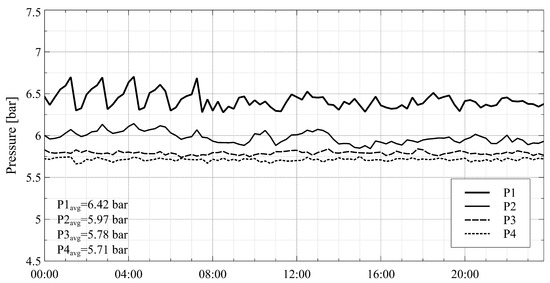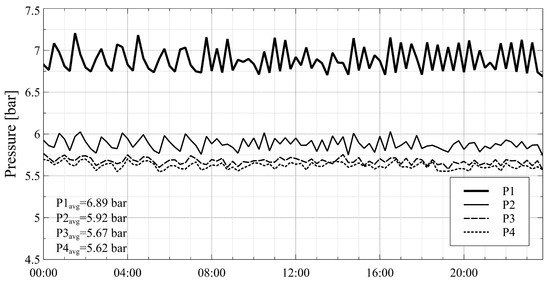 The pressure measurements presented in Figure 6 reveal the magnitude and distribution of system losses. The pronounced high-amplitude fluctuations observed at the compressor outlet (P1) directly reflect the influence of load/unload cycling. At the compressor room outlet (P2), a pressure difference of approximately 1 bar was detected, accounting for the majority of the total 1.25-bar pressure drop. In contrast, measurements at the most distant points of the distribution network, corresponding to P3 (DN80) and P4 (DN50), indicated only a 0.25-bar reduction, representing about 20% of the overall loss. These results demonstrate that the primary source of pressure losses lies within the compressor room, while the contribution of the distribution network remains limited.