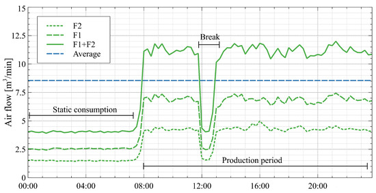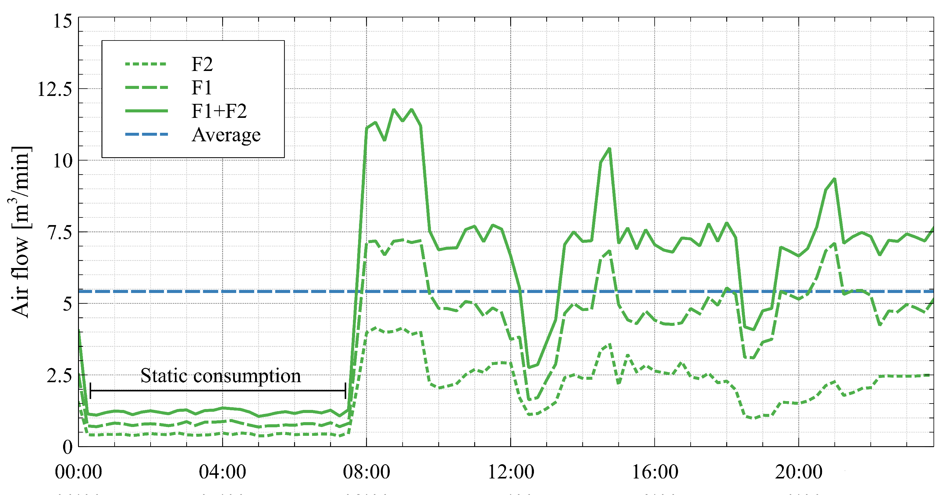 Once production commenced, the total demand increased to the range of 11–12 m3/min, whereas a temporary decline was observed during the short midday break. However, the system was unable to fully switch to an idle regime during this period. Throughout the day, the average flow was determined to be 8 m3/min. Moreover, the F1 line carried higher and more fluctuating flows compared to F2 during production, indicating an unbalanced distribution between the lines. Although the presence of leakages produced a smoother flow profile by creating a constant load, such regularity reflects an unfavorable condition in terms of system efficiency.