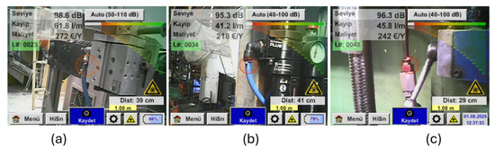Screenshots from leakage detection measurements: (a) leakage at a cylinder connection, (b) leakage at an air preparation unit connection, (c) leakage at a valve connection.