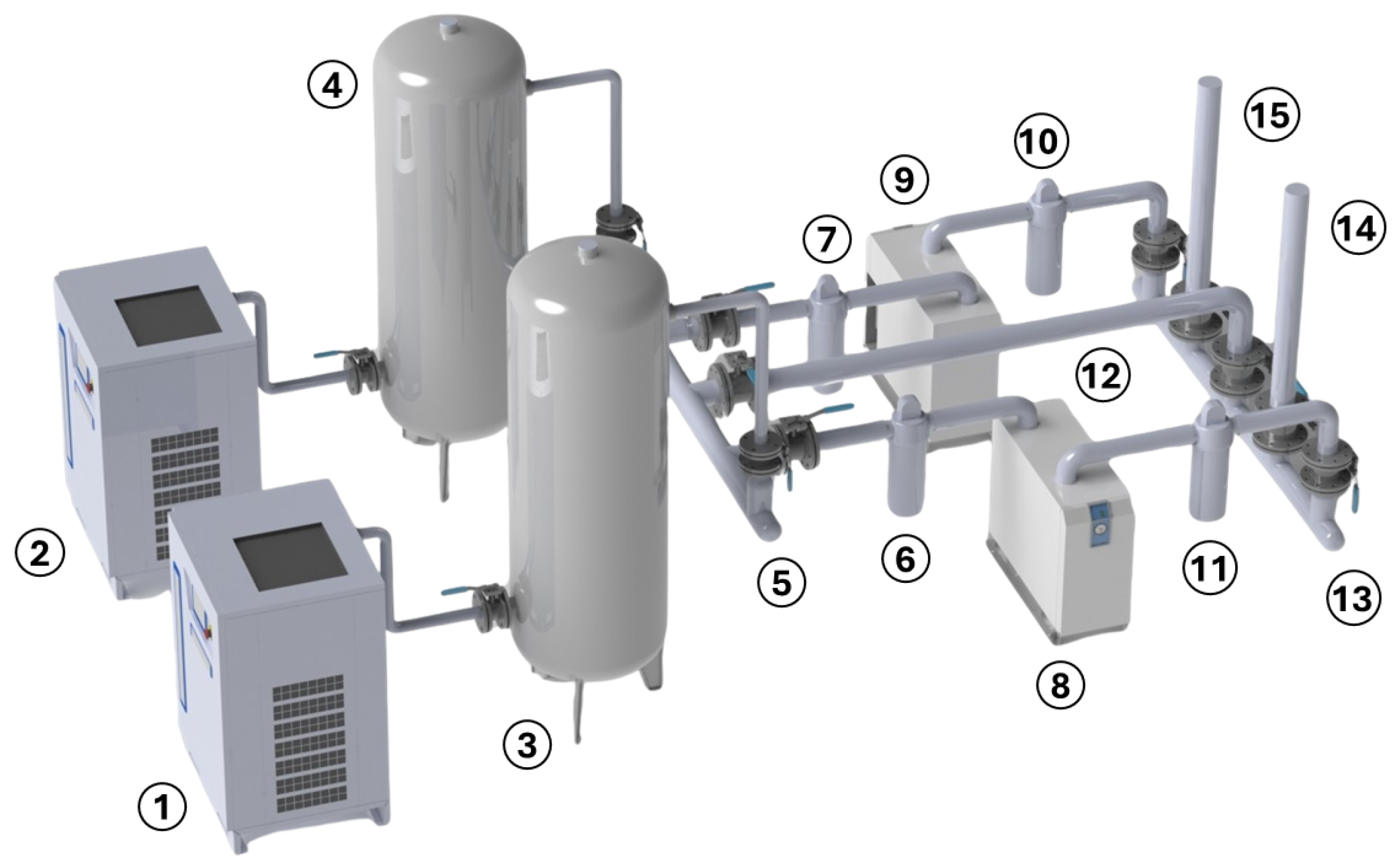 On the supply side, each compressor was connected to a separate DN50 pipeline and equipped with a dedicated wet air receiver. This configuration facilitates the damping of pressure fluctuations, enabling more stable operation of the parallel compressors. The tank outlets were combined in a DN100 wet collector, with condensate drains installed at both the collector and tank bottoms. In this way, the condensate load was removed from the system, thereby supporting dryer performance. In addition, a DN100 dryer by-pass line was provided from the collector to avoid production interruptions during maintenance or failure. This precaution allows continuous system operation under maintenance conditions. The pipelines from the wet collector to the dryers were designed with DN80 diameters, and each line was equipped with a 1 µm pre-filter. This arrangement protects the dryer heat exchangers from particle and oil contamination, thus improving drying capacity. The dryer outlets were kept at the same diameter, and the airflow was passed through 0.01 µm final filters before being balanced in a DN100 dry collector. The dry collector was also equipped with a condensate drain, thereby improving the quality of air supplied to the ring lines.