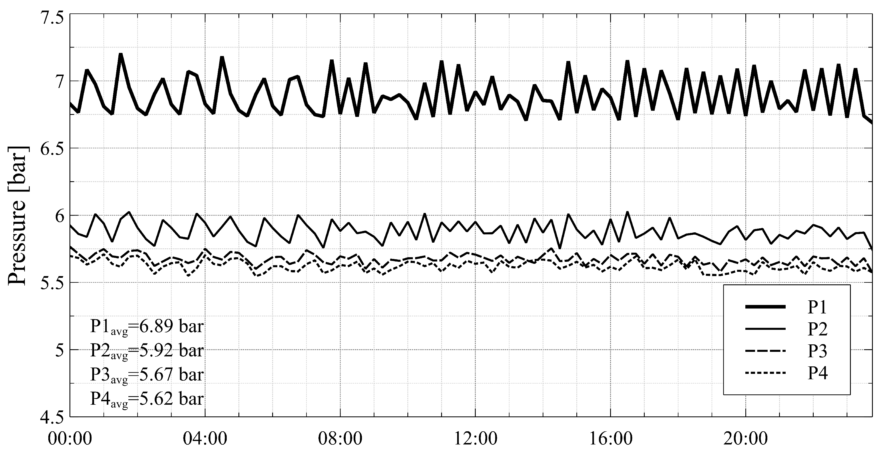 Figure 6 reveal the magnitude and distribution of system losses. The pronounced high-amplitude fluctuations observed at the compressor outlet (P1) directly reflect the influence of load/unload cycling. At the compressor room outlet (P2), a pressure difference of approximately 1 bar was detected, accounting for the majority of the total 1.25-bar pressure drop. In contrast, measurements at the most distant points of the distribution network, corresponding to P3 (DN80) and P4 (DN50), indicated only a 0.25-bar reduction, representing about 20% of the overall loss. These results demonstrate that the primary source of pressure losses lies within the compressor room, while the contribution of the distribution network remains limited.