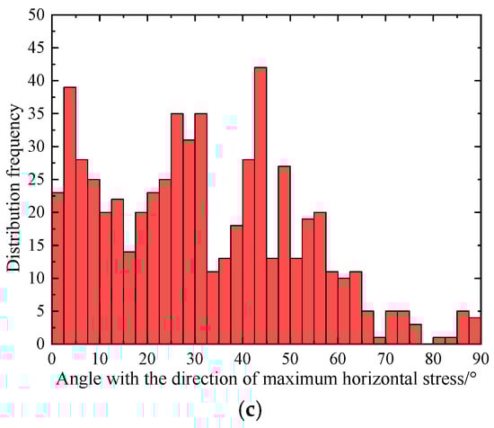 Distribution of the angle between natural fracture orientation and maximum principal stress direction at different locations: (a) left side; (b) center; (c) right side.