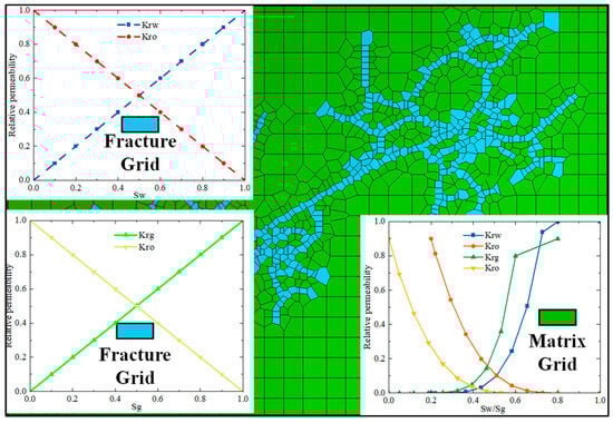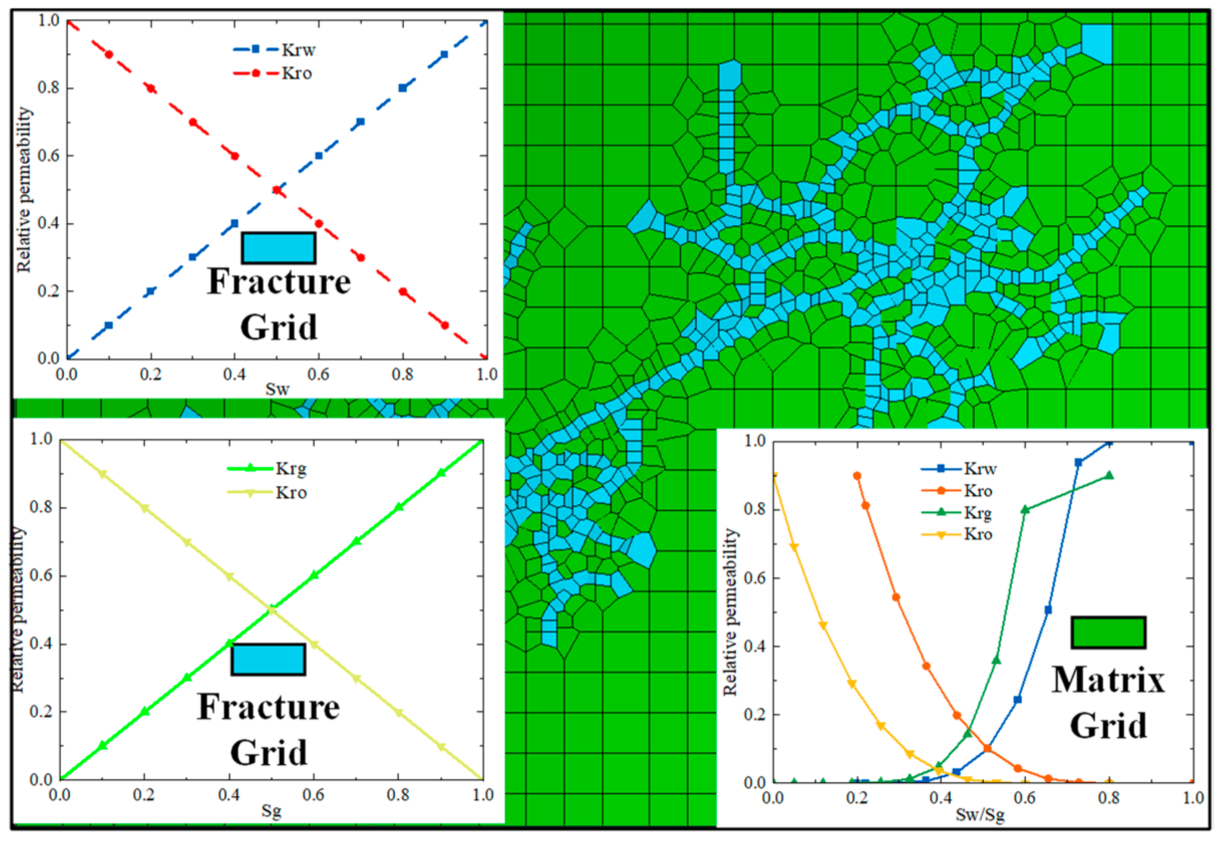 To address the differences in oil-water flow mechanisms within different regions of the reservoir, this paper establishes a relative permeability curve zoning model based on grid-type mapping. This model assigns distinct relative permeability curves according to the medium type represented by each grid cell: for grids characterizing fractures, the classic straight-line intersecting relative permeability curves are applied; for grids representing matrix rock blocks, the relative permeability relationships determined from onsite core flooding experiments are utilized. This approach effectively captures the flow heterogeneity inherent in the fracture-matrix dual-porosity system (Figure 11).