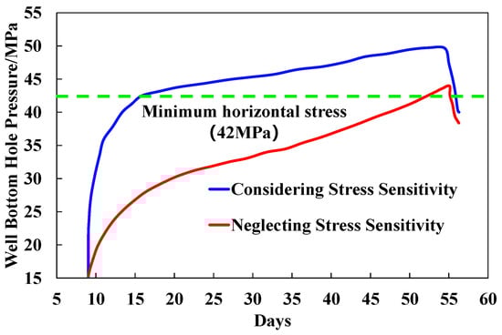During the fracture-flooding operation, an effective fracture network must be created around the wellbore. This requires the bottomhole pressure to consistently exceed the minimum horizontal principal stress (42 MPa) to ensure fracture initiation and propagation. Figure 13 shows the bottomhole pressure curves of the fracture-flooding well under the two scenarios. The simulation results demonstrate that in the model incorporating the time-varying stress effect, the bottomhole pressure remains above this threshold throughout the entire fracture-flooding process, satisfying the mechanical conditions for fracture formation. Conversely, in the model that ignores stress sensitivity, the bottomhole pressure never reaches the critical value required for fracture initiation.