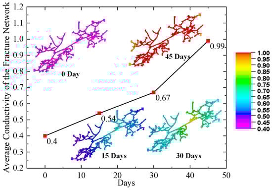 When the time-varying stress effects of the fracture-flooding network are considered, the fractures exhibit a small initial aperture and consequently low flow conductivity under the action of in situ stresses. Simulation results indicate that as the fracture-flooding operation progresses, the average conductivity of the fracture network demonstrates a distinct two-stage recovery characteristic (Figure 14).