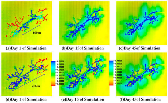 Figure 15 illustrates the distribution patterns of water saturation during the fracture-flooding process under the two scenarios. In the initial stage (0–7 days), as injected water begins to enter the fractures, it primarily migrates along the fracture network in both cases, with only a small amount entering the matrix. When the time-varying stress effect is neglected, the propagation distance of the injected water within the fractures is longer (Figure 15d, 256 m), significantly greater than that observed in the scenario considering time-varying stress (Figure 15a, 160 m). During the mid-term stage (7–15 days), the influence of stress time-dependency on the sweep efficiency is not pronounced. This is because the injected water has not yet established significant connectivity with the production wells, avoiding large-scale water channeling or ineffective cycling. Furthermore, since the total injected water volume is identical in both scenarios, the swept area shows no substantial difference (Figure 16). Simulation results indicate that the effective sweep efficiency of the injected water throughout the entire fracture-flooding process is 0.246 and 0.237, respectively (the well group’s controlled area is 323,256.8 m2).