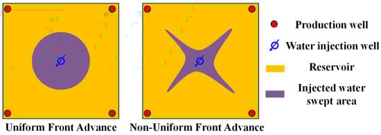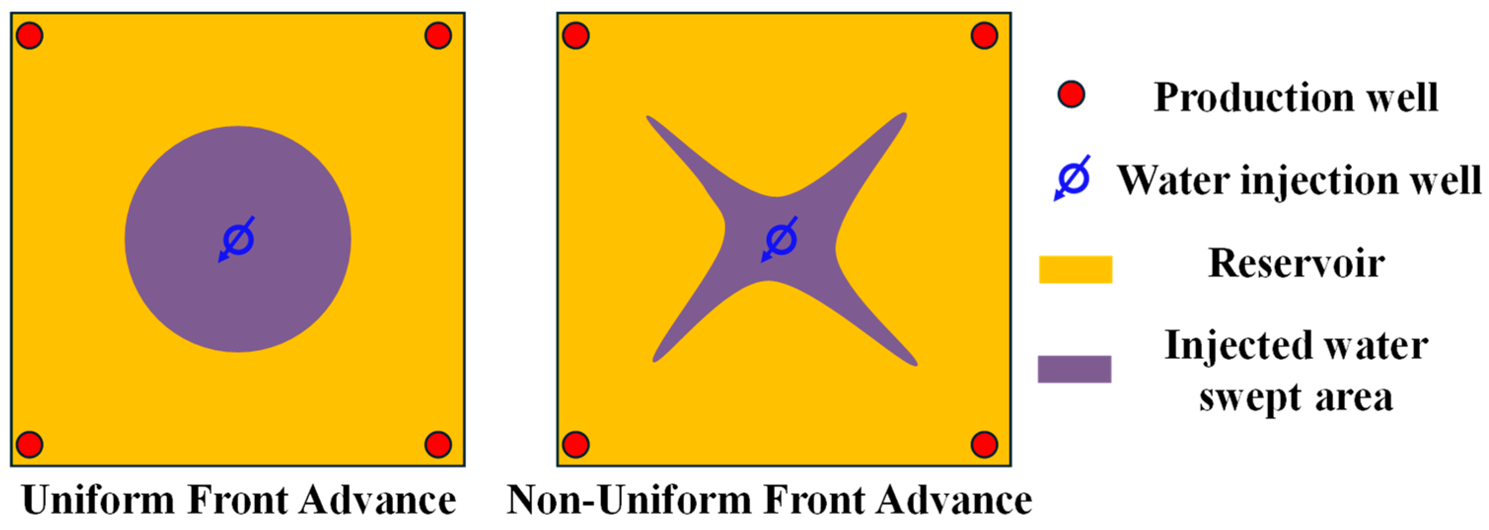 In the context of developing remaining oil via waterflooding in reservoirs, the uniformity of the waterflood front advancement significantly influences the ultimate recovery efficiency. A more uniform waterflood front implies that all points on the front are approximately equidistant from the injection well, representing equal propagation distances for the displacing water and indicating the absence of rapid water breakthrough along any specific direction. Consequently, an ideal waterflood front should exhibit a shape characteristic that approximates a circle as closely as possible (Figure 17). Based on this principle, the waterflood fronts under the two scenarios are analyzed. The first metric is the Perimeter-to-Area ratio (PA ratio) of the waterflood front. A more uniform advance, resulting in a shape closer to a circle, will yield a PA ratio closer to 1 (Equation (18)).