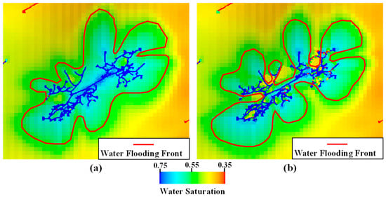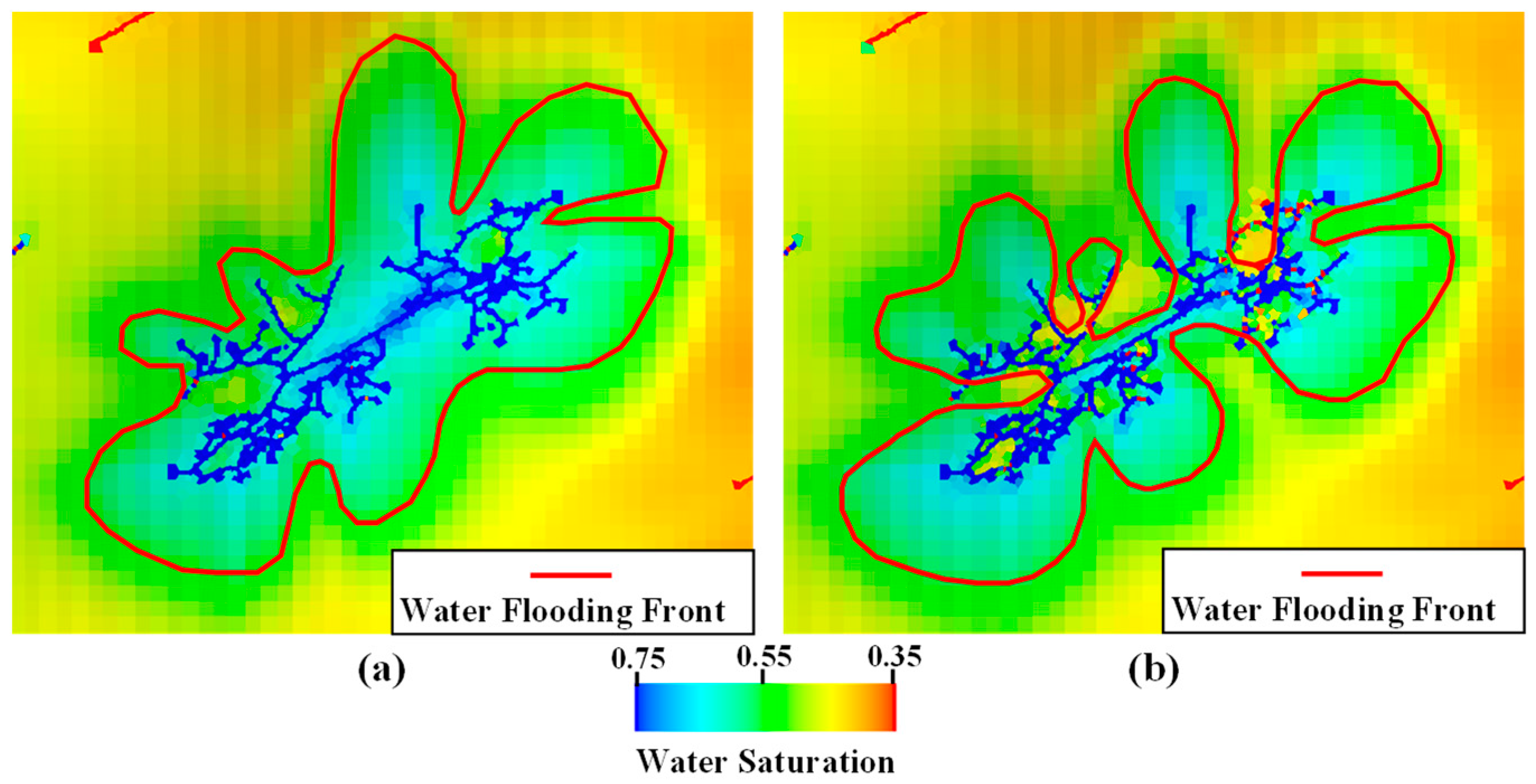 Water flooding front morphology under two conditions ((a): Considering Stress Time-Dependency; (b): Without Considering Stress Time-Dependency).