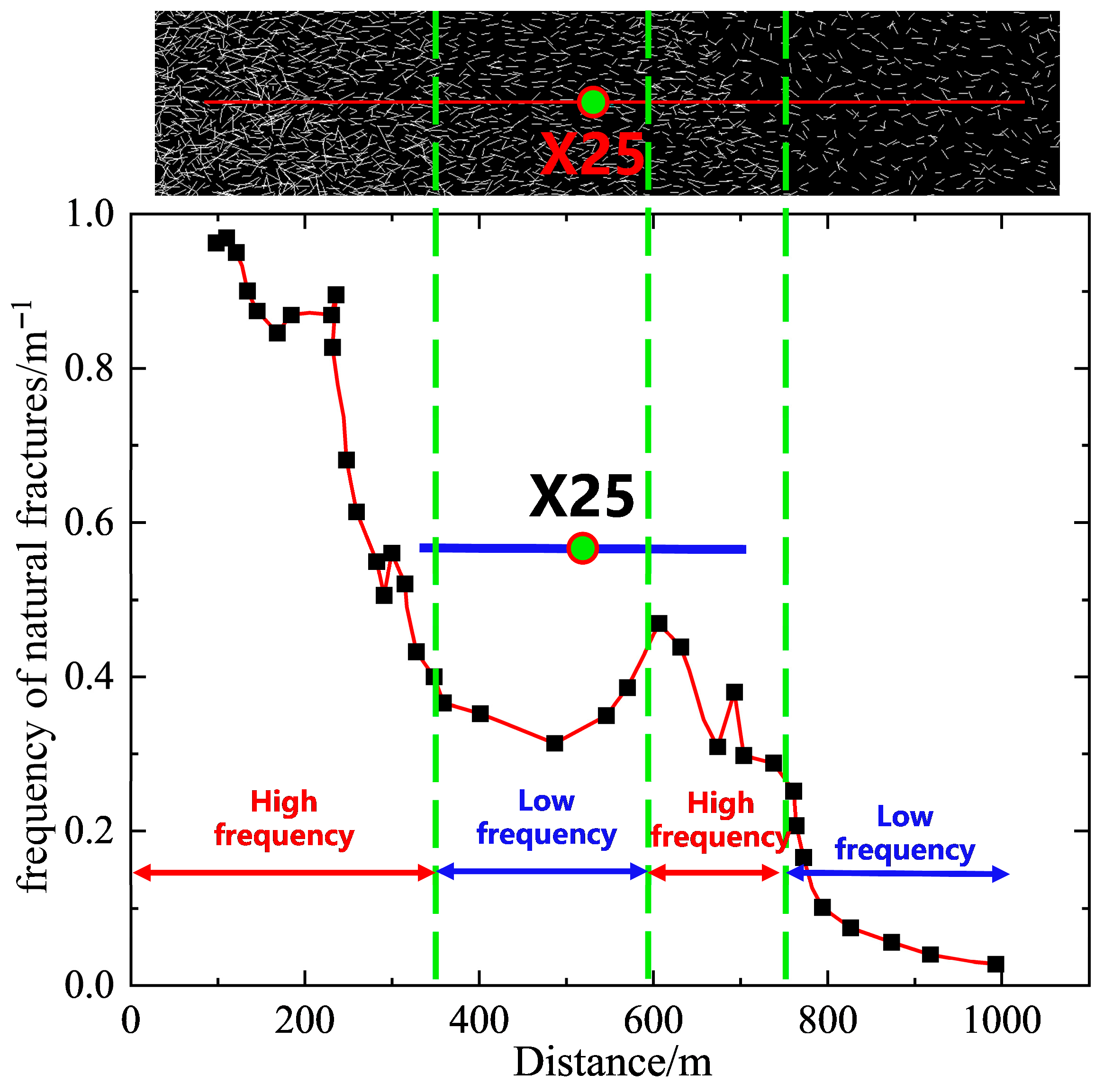 Based on the field geological model, a simulation of fracture network propagation was conducted for the well group containing the X25 well. Figure 2 illustrates the distribution of natural fracture density along the direction of the maximum horizontal stress near the X25 well. The X25 well is situated between two zones of high natural fracture density. Consequently, natural fractures exert a significant influence on the morphology of the fracture-flooding-induced fracture network from the X25 well.