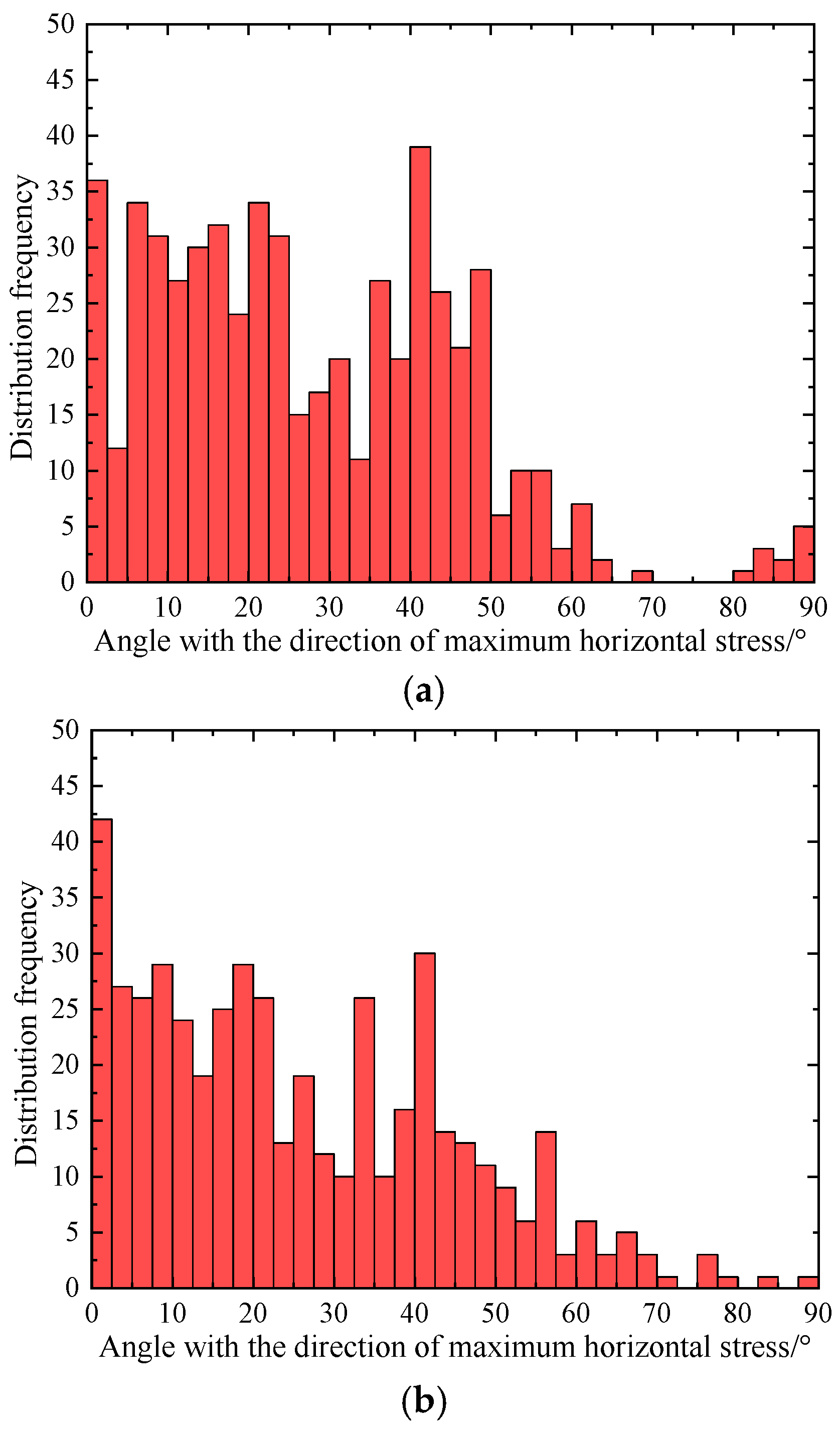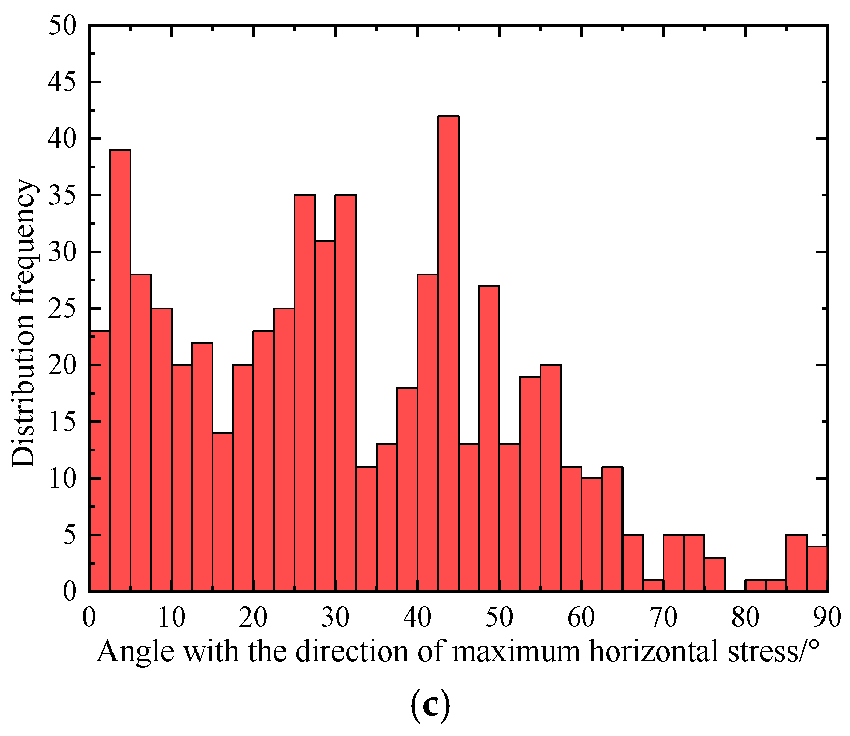 Specifically, within the high-density zone on the left, the natural fractures have an average angle of 27.39° and a median angle of 23.96° relative to the direction of the maximum horizontal stress. In the central low-density zone, the average angle is 25.78° with a median of 21.98°. For the high-density zone on the right, the average angle is 31.39° and the median is 29.74°. The orientation of natural fractures in the central area is closer to the direction of the maximum horizontal stress. Furthermore, the fracture density in the central area is lower than that on the left and right sides (Central: 0.314, Left: 0.561, Right: 0.470). This lower density implies a reduced probability of the propagating fracture-flooding fractures encountering natural fractures when extending through the central zone. Therefore, the natural fractures in the central area have a lesser impact on altering the propagation direction of the fracture-flooding fractures compared to the influence exerted by the natural fractures on either side. Figure 3 illustrates the distribution of angles between the orientations of natural fractures and the direction of the maximum principal stress at different locations near Well X25.