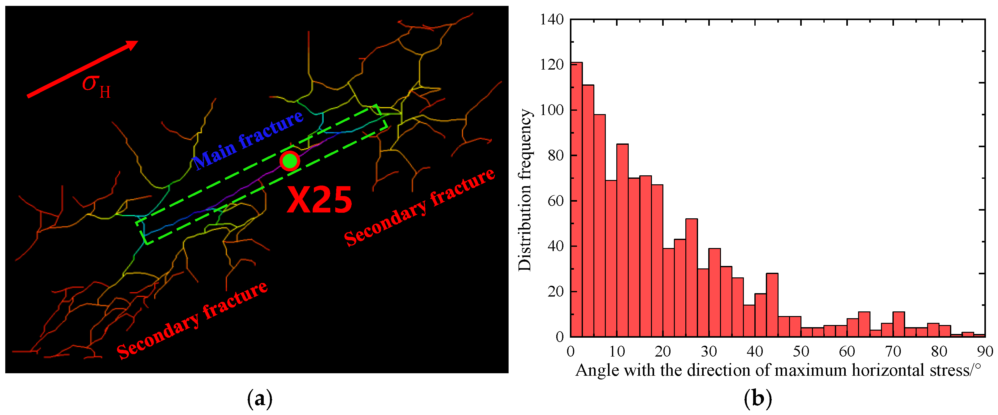Modeling result: Geometry of the fracture-flooding network simulated by the Unconventional Fracture Model (UFM), showing (a) the morphology and (b) the angle distribution relative to the maximum horizontal stress. (a) Fracture network morphology diagram of fracture-flooding fractures. (b) Distribution of the angle between the fracture network and the maximum horizontal stress direction.