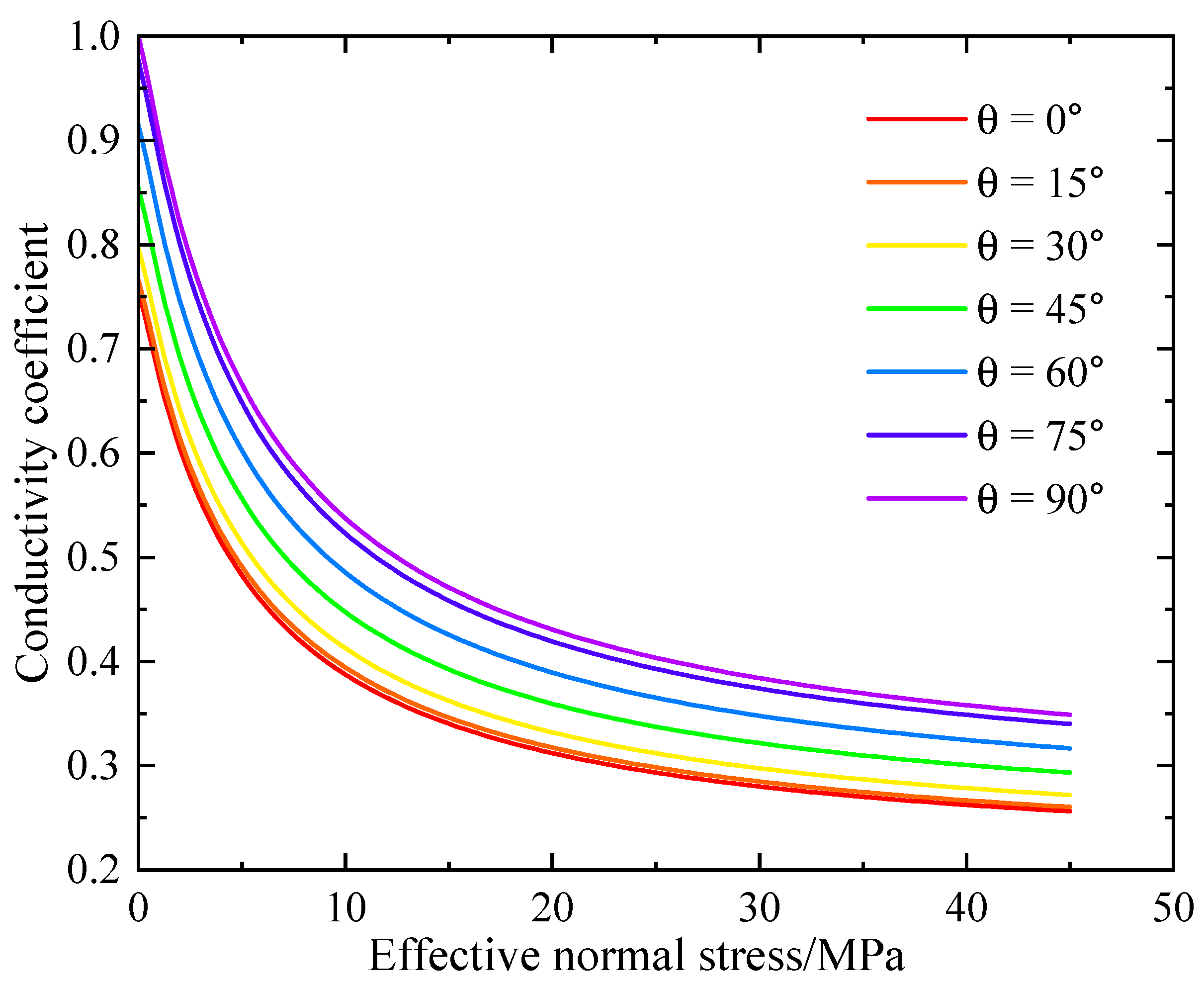 Therefore, the variation in fracture conductivity with increasing normal stress under different intersection angles can be obtained, as shown in Figure 8.