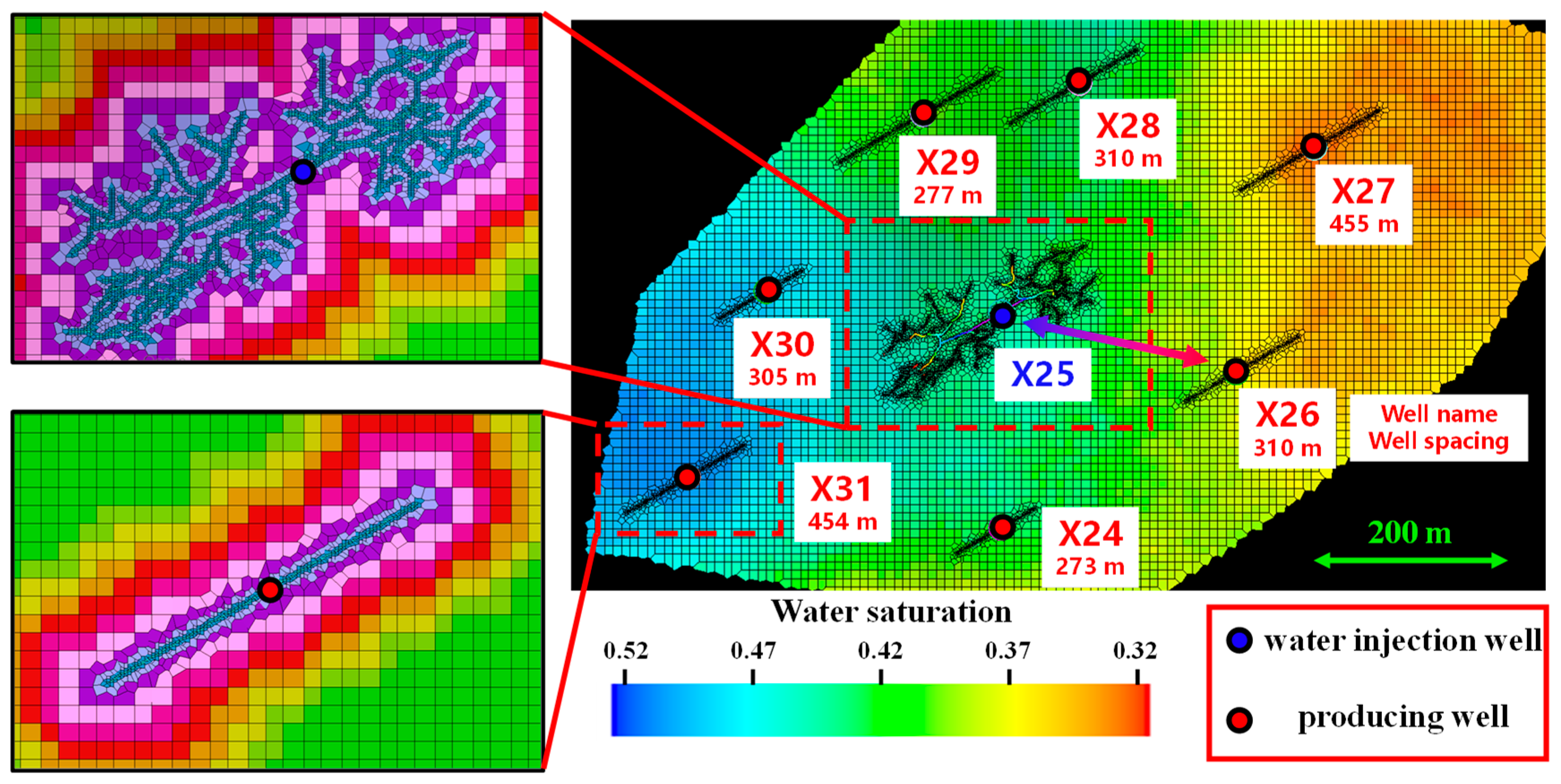 To validate the effectiveness of the nonlinear deformation-flow coupling model for fracture-flooding fractures constructed in the previous section, this section conducts a case study utilizing actual well group production data. A comprehensive performance evaluation of the model is performed by comparing the simulation results with field-observed data. Figure 10 illustrates the sector model of the field fracture-flooding well group. The sector model contains 8 vertical wells, including one water injection well, X25 (the fracture-flooding well), and seven production wells.