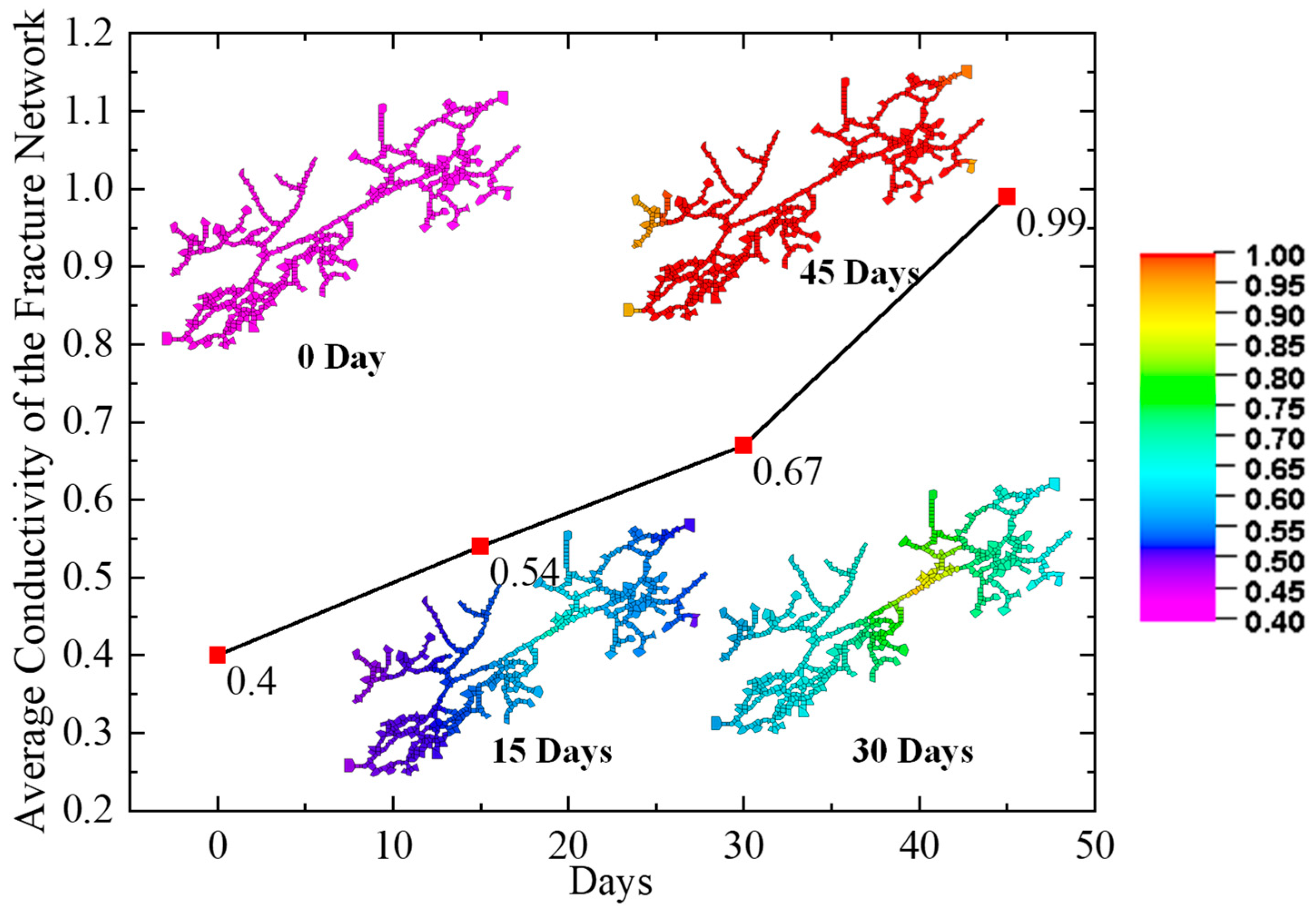 Initial Slow Recovery Stage (e.g., Injection Start-Day 30): During this stage, the average conductivity coefficient increased gradually from an initial value of 0.4 (near-closure state) to 0.67 by day 30. The underlying mechanism is that the initial injection pressure is primarily utilized to overcome the in situ stress and elevate the fluid pressure within the fractures, thereby reducing the effective normal stress that compacts them. The recovery of fracture aperture and conductivity is relatively slow during this pressure-building phase.