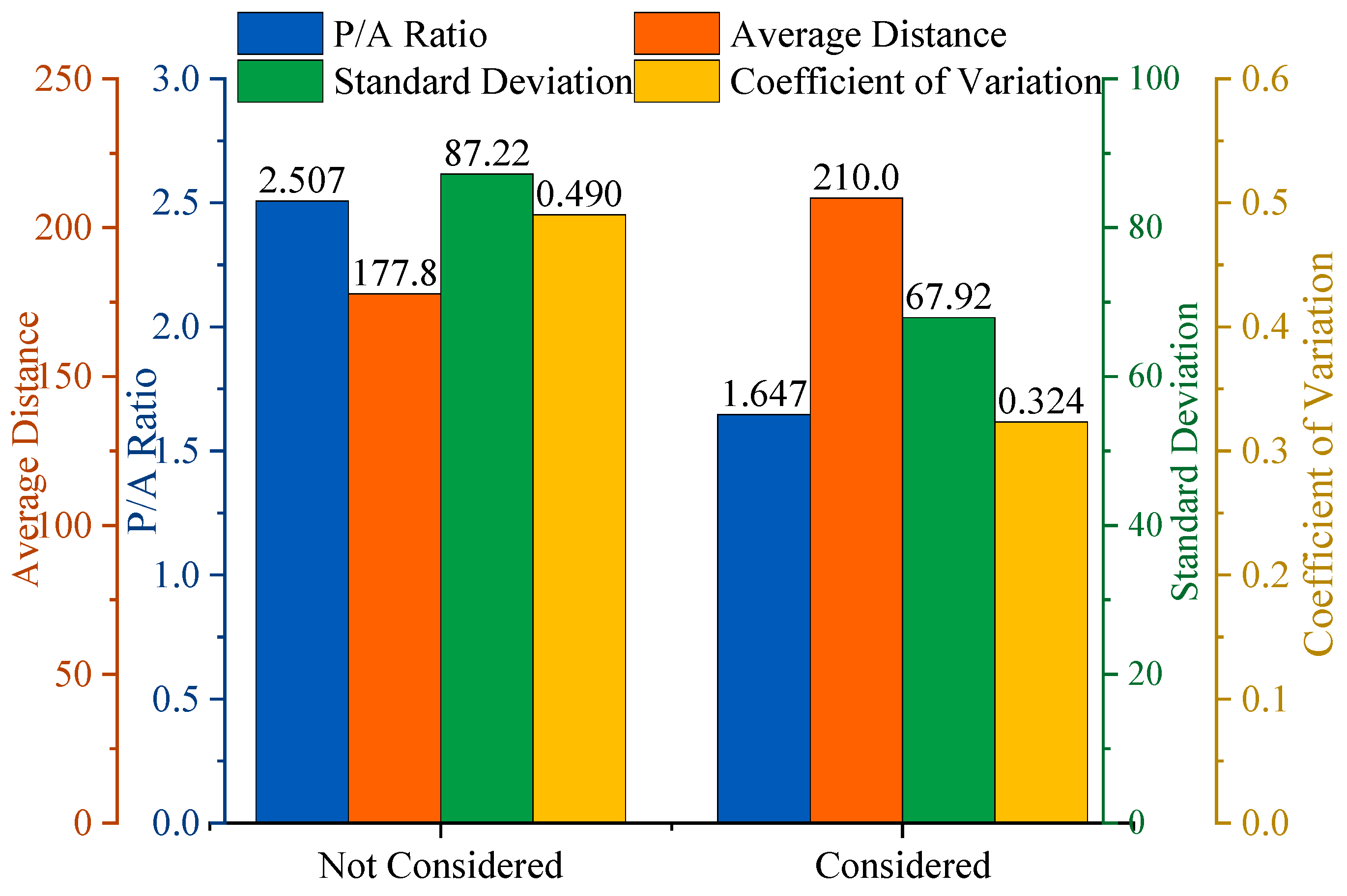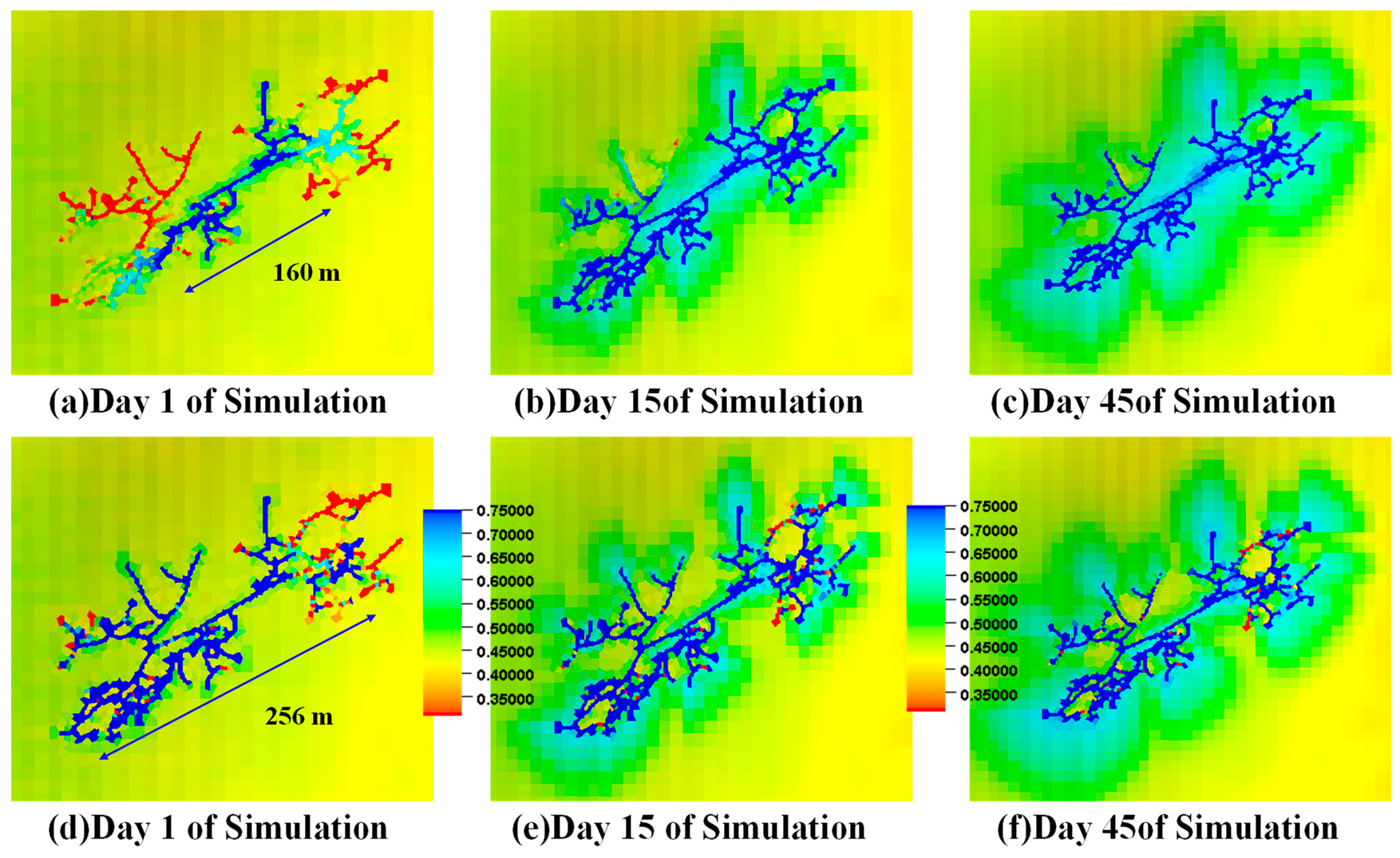 Figure 18 presents the calculation results for the two different scenarios. The results demonstrate that when the time-varying stress characteristics of fracture properties are considered, the uniformity of the waterflood front advancement is significantly improved. The perimeter-to-area ratio decreases from 2.507 to 1.647, and the coefficient of variation in the waterflood front is reduced from 0.490 to 0.324.