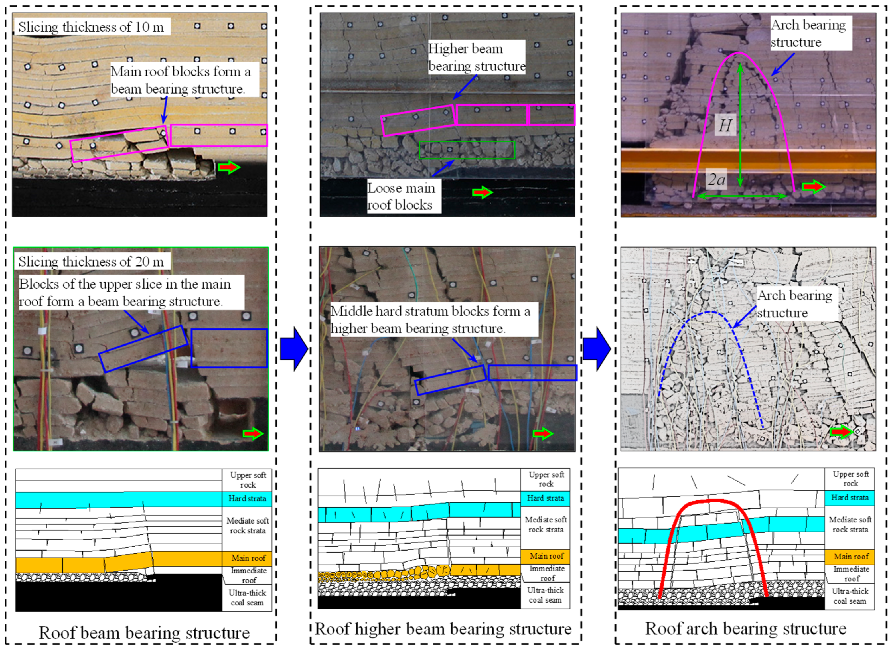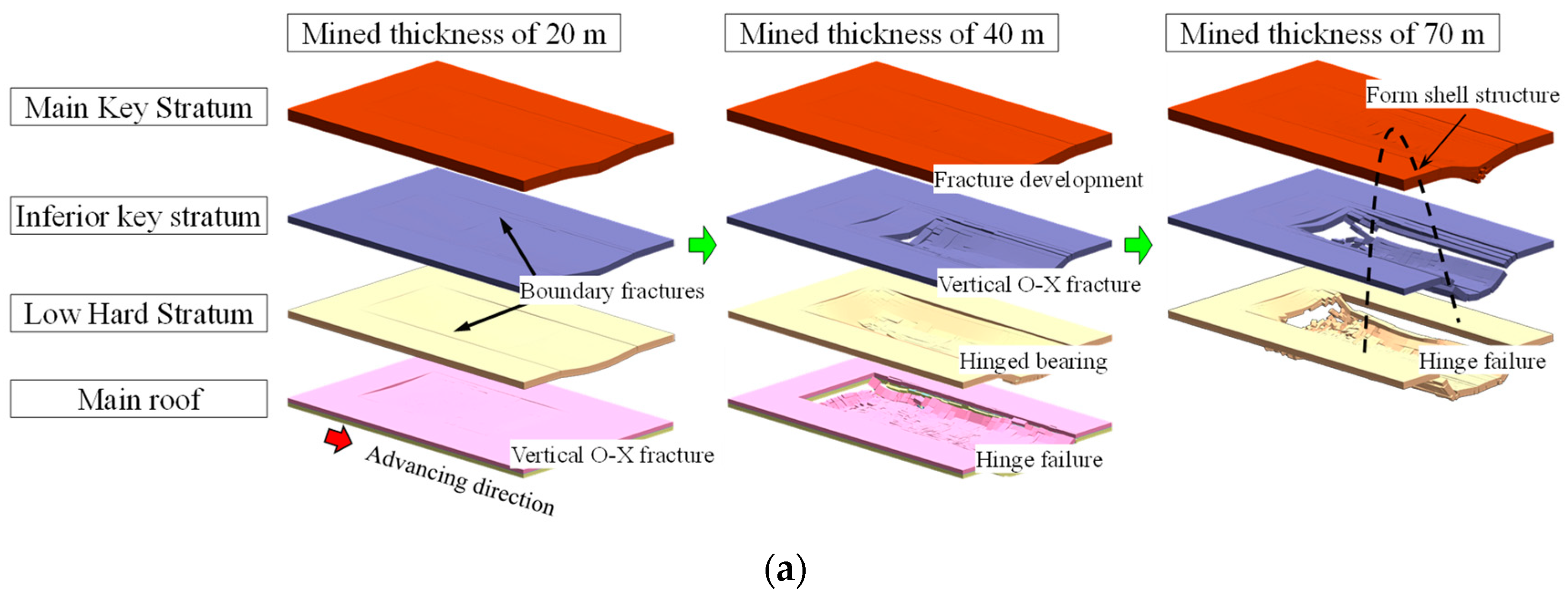 - This study reveals the evolution process of the overlying strata structure in multi-slice mining of the ultra-thick coal seam, which follows the sequence of “beam structure–higher beam structure–shell structure”. It also illustrates the fracture and articulation characteristics of the overlying strata in multi-slice mining of the 70 m ultra-thick coal seam in East Junggar: in the early stage, fractured rock blocks of the lower hard strata form beam-type articulation; in the middle stage, the lower articulation structure weakens and fails, and the beam-type articulation structure moves upward in a stepped manner; in the late stage, the mined-out space continues to expand, and the far-stope strata undergo transverse O-X fracture, with the fractured rock blocks squeezing to form a shell. The corresponding forms of roof bearing structures are clarified, and the delamination fracture and movement mechanism of load-bearing strata as well as the stability conditions of arch bearing structures are analyzed.