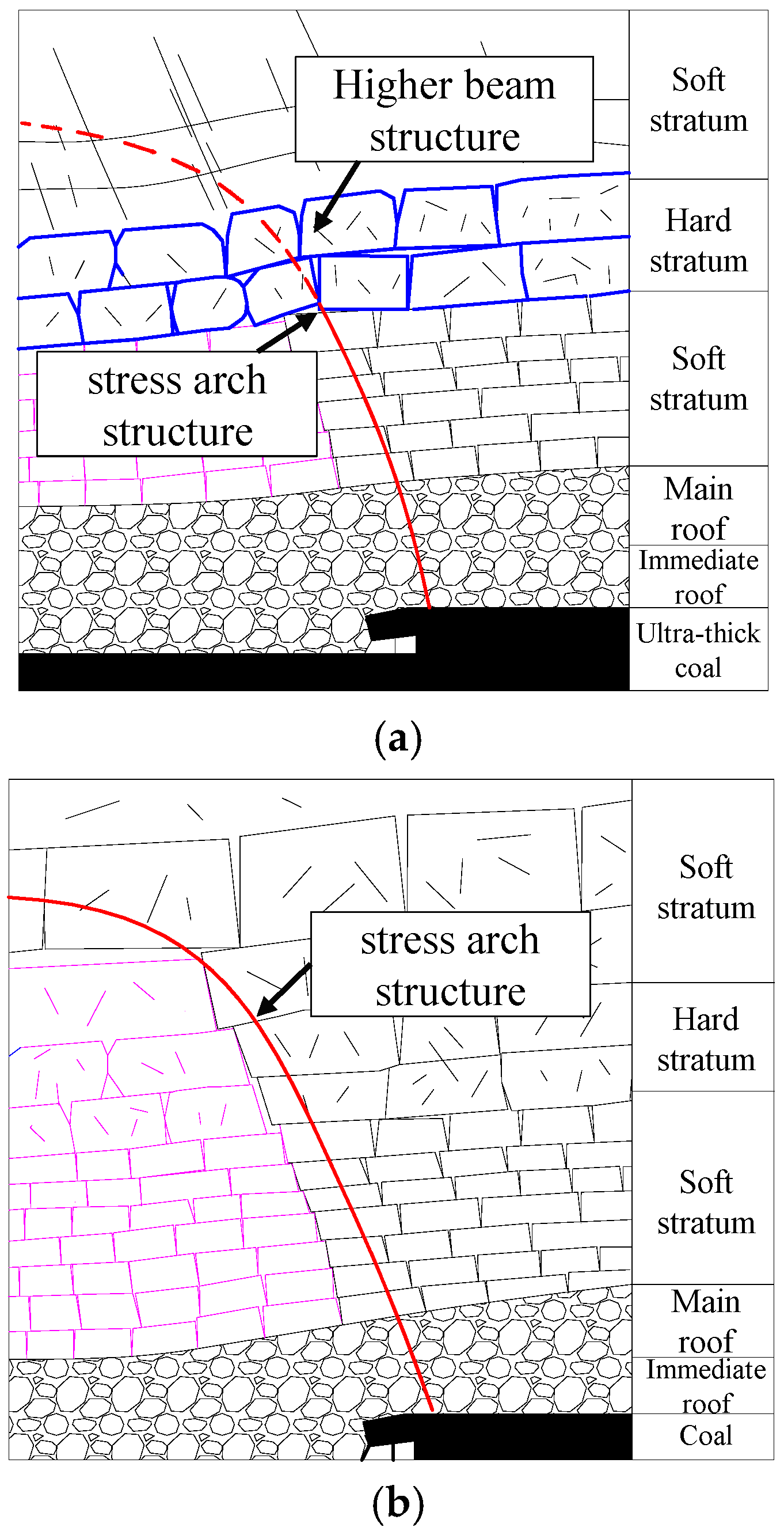 - Wang, F.; Xu, J.L.; Xie, J.L. Effects of arch structure in unconsolidated layers on fracture and failure of overlying strata. Int. J. Rock Mech. Min. Sci. 2019, 114, 141–152. [Google Scholar] [CrossRef]