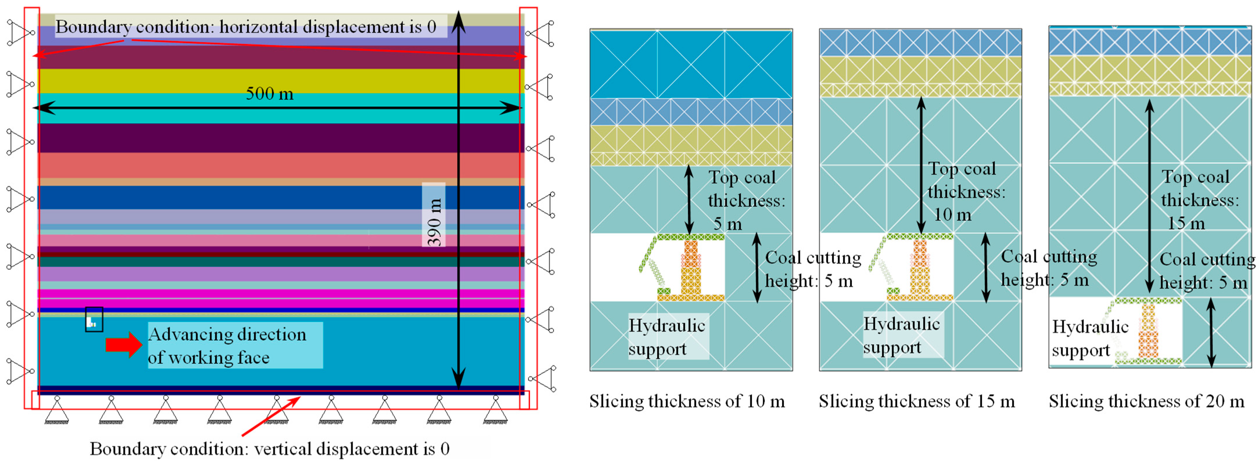 - Mechanical models of the support–surrounding rock relationship under different overlying strata structures are established. The range of strata to be controlled by the support in different mining stages of the ultra-thick coal seam is defined, and the corresponding calculation method for the support load is proposed. It reveals the ground pressure behavior characteristics of multi-slice mining of the ultra-thick coal seam: “under the near-stope roof bearing structure, the load first decreases and then increases slowly; under the far-stope roof bearing structure, the load increases abruptly and then tends to be stable”. During the multi-slice mining of the ultra-thick coal seam, due to the large number of near-stope hard strata, the load on the hydraulic support under the near-stope roof bearing structure is small and increases slowly. As the roof bearing structure moves away from the stope and the number of hard strata decreases, the load on the hydraulic support under the far-stope roof bearing structure increases abruptly. When the slicing mining thicknesses are 10 m, 15 m, and 20 m, the increase amplitudes of the support load are 26.64%, 24.37%, and 23.39%, respectively.