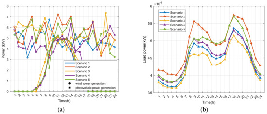 Wind–solar power output and load curves in typical scenarios: (a) renewable power output curves; (b) load curves.