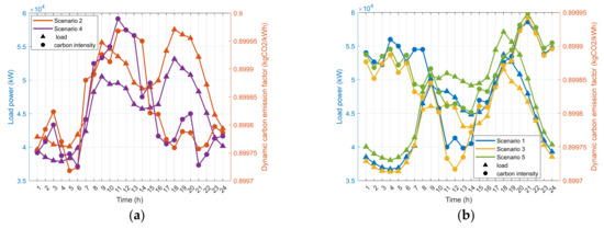 Scenario 1: Electricity–carbon peak alignment. As shown in Figure 3a, this scenario arises when renewable energy output falls within its minimum range during load peak hours due to meteorological conditions (e.g., windless cloudy days and windy nights), while reaching its maximum range during load troughs. During morning and evening load peaks, renewable generation decreases, necessitating increased output from thermal and CHP units to meet electricity demand, thereby elevating carbon intensity to daily peak levels. Conversely, during load troughs, lower demand coincides with higher renewable output, minimising the operation of high-carbon units such as thermal and CHP plants, resulting in the lowest carbon intensity range. The alignment between load curves and dynamic carbon emission factor curves indicates that this scenario resembles traditional systems dominated by thermal and CHP units, where load peaks synchronise with carbon emission peaks. Thus, this study defines it as the “electricity–carbon peak alignment” scenario.