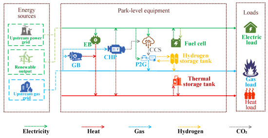 A park-level integrated energy system (PIES) is an energy supply framework within a specific geographical boundary that, through an integrated planning and intelligent management platform, achieves the synergistic production, efficient conversion, optimised storage, and rational consumption of various energy forms such as electricity, heat, cooling, and gas. Its core characteristics are manifested as “horizontal multi-energy complementarity” and “vertical source–grid–load–storage coordination,” which can effectively enhance the park’s energy self-sufficiency rate and comprehensive energy utilisation efficiency. The PIES represents a typical application of integrated energy systems at the regional level. It places a greater emphasis on the integrated utilisation of distributed new energy generation equipment, demand-side flexibility resources, and low-carbon technologies. The PIES can provide users with more economical, efficient, and environmentally friendly integrated energy services. Consequently, achieving the low-carbon optimal operation of PIESs has become a current research hotspot [1,2,3].