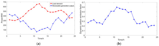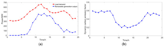 “Electricity–carbon peak alignment” scenario: (a) renewable output and load curves; (b) dynamic carbon emission factor.