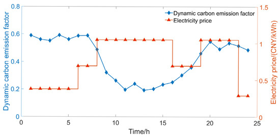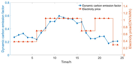 In this paper, the low-carbon benefits brought to the PIES by user participation in low-carbon demand response are validated under the typical scenarios of “electricity–carbon peak alignment” and “electricity–carbon peak misalignment”. The carbon allowance price is set with reference to the projected 2024 domestic carbon market price from reference [22], with an average price of 91.6 CNY/t. For comparison with the results of the low-carbon demand response analysis, the electricity demand response in the case study considers a price-based demand response guided by electricity prices, with the time-of-use (TOU) tariffs shown in Table 2.
