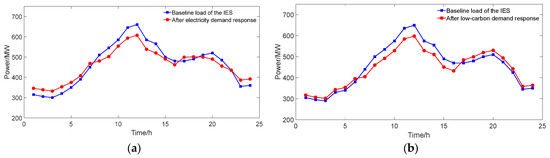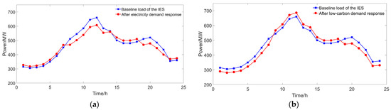 Figure 9 compares the time-of-use electricity tariff with the dynamic carbon emission factor. Figure 10 illustrates the load changes in the PIES before and after user participation in electricity demand response and low-carbon demand response under the “electricity–carbon peak alignment” scenario. As shown in Figure 10a, under the electricity demand response mechanism guided by electricity prices, users proactively reduce or shift their load from the peak period of 8:00–15:00 to off-peak periods to save on electricity costs. In the “electricity–carbon peak alignment” scenario, the peak electricity consumption period is also the peak carbon emission period. Therefore, the peak-shaving and valley-filling effect of electricity demand response on the load can simultaneously reduce both the energy costs and carbon emissions of the PIES. Figure 10b demonstrates that low-carbon demand response can similarly achieve a peak-shaving and valley-filling effect on carbon emissions. By reducing and shifting the load during the high-carbon period of 8:00–15:00, it also serves to lower the PIES’s electricity costs and carbon emissions. Notably, during the evening peak period of 19:00–21:00, the electricity price is high. However, due to higher renewable energy output at this time, the carbon emission factor is actually low. In this situation, further reducing or shifting the load would be detrimental to the accommodation of renewable energy, leading to a waste of renewable resources. In contrast, low-carbon demand response encourages users to shift their load from the peak carbon emission factor period to the 19:00–21:00 slot, which facilitates the consumption of renewable energy and significantly reduces the PIES’s carbon emissions. Table 3 presents the carbon emission reduction and the corresponding benefits for the PIES under different demand response mechanisms. The data in the table indicate that in the “electricity–carbon peak alignment” scenario, both the carbon emission reduction and the resulting benefits are lower under electricity demand response compared to low-carbon demand response. With low-carbon demand response, the CO2 emissions from PIES users are reduced by 29.79 tonnes, and the reduction benefits increase by CNY 2729. Therefore, in such scenarios, both electricity prices and carbon emission factors can effectively guide users. While both demand response mechanisms contribute to energy conservation and carbon reduction, low-carbon demand response demonstrates a superior effect in reducing carbon emissions.